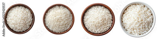 Bowls of Delicious Rice in Various Stages of Closeup view of traditional white rice in wooden and ceramic bowls showcasing the different phases of the grain s journey from field to table