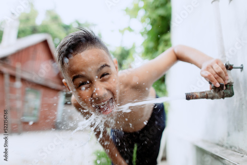barefoot beach, basin, clothes, drink, eye, face, faucet, flagged, fun, game, grass, greenery, house, jet, mouth, outdoors, puddle, roof, short, spray, summer, tongue, tree, water, yard