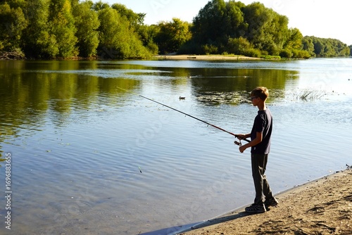 Boy fishing by a calm river, enjoying a peaceful afternoon. The scene captures the tranquility of nature as he patiently waits for a catch against a backdrop of lush green