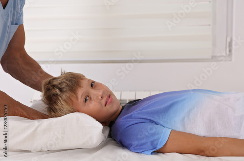 Boy having chiropractic back adjustment. Osteopathy, Physiotherapy and Kinesiology for children. Bad posture correction