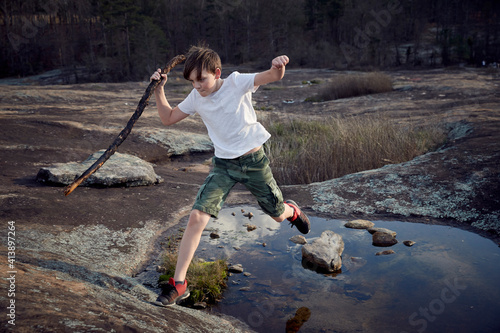 boy, jumping, puddle, hiking, childhood, adventure, casual clothes, holiday maker, nature, get-away, water, vacation, stick, lifestyle, motion, balance, holding, tour tourism, calmness, mountain, us, georgia, exploration, destination, environment, avocation, front view, full-length, day, outdoors, one person, male