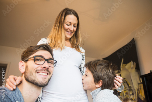 Boy kissing pregnant mother's belly while father is looking at camera, Munich, Germany