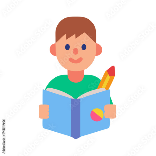 Boy reading a book with pencil in simple vector style