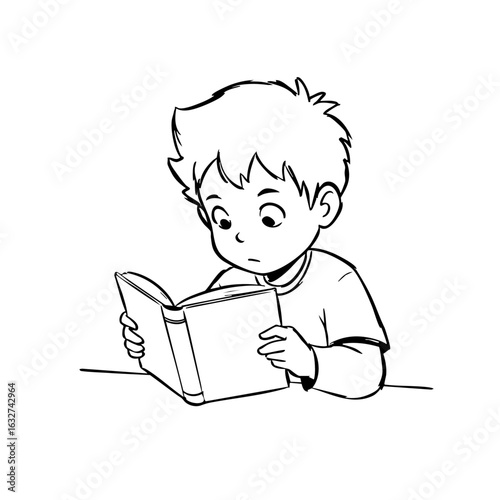 Boy reading book attentively at table. Young child engrossed in literature enjoys quiet reading time. Illustration of boy reading book perfect for children's books, educational materials,
