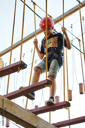 Boy walking on the ropes in a rope park