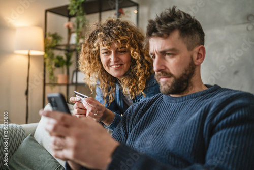 boyfriend and girlfriend use cellphone and credit card shopping online