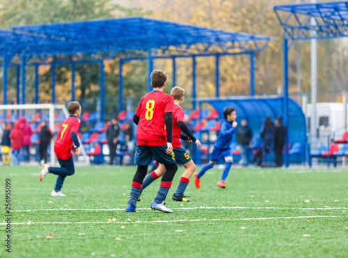 Boys in red white blue sportswear running on soccer field. Young footballers dribble and kick football ball in game. Training, active lifestyle, sport, children activity concept