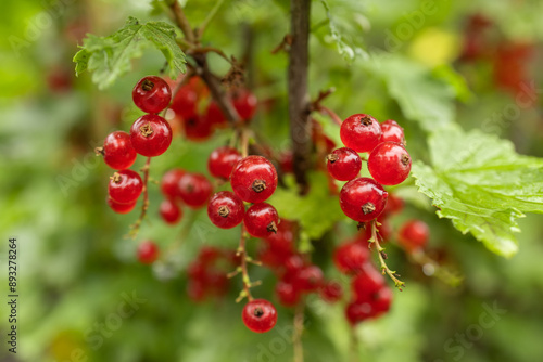 branch of ripe red currant in a garden on green background