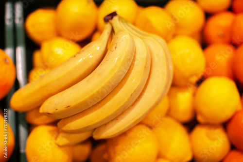 Branch of yellow ripe bananas and oranges.Tropical fruits on sale.