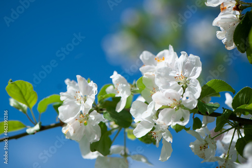 Branches of blossoming apple tree macro with soft focus on gentle light blue sky. Beautiful floral image of spring nature.