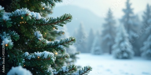 Branches of evergreen Christmas tree against snowy background, festive atmosphere, , winter landscape