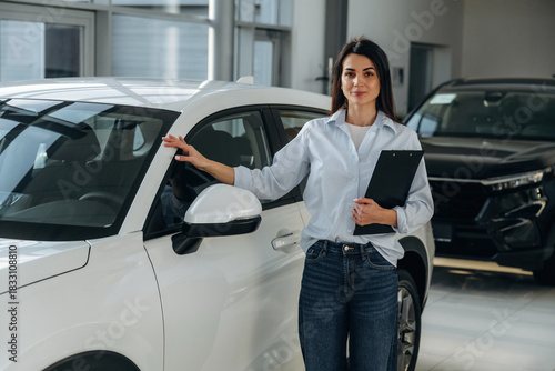 woman, posing, car, auto, showroom, brand, new, vehicle, transport, modern, dealership, environment, female, 1, person, formal, wear, clothes, shirt, indoor, brown, hair, brunette, gorgeous, pretty, beautiful, model, human, business, buy, sell, ownership, polished, surface, clean, clear, technology, rent, quality, product, adult, caucasian, european, white, ethnicity, facial, expression, expensive, luxury