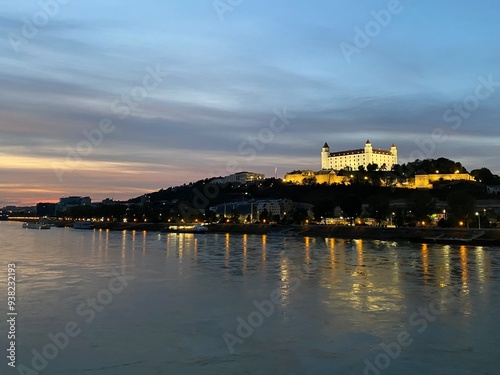 slovakia, architecture, bratislava, building, castle, center, city, danube, europa, historical, landscape, light, river, water, night, view, tour tourism, summer, sky, sunset