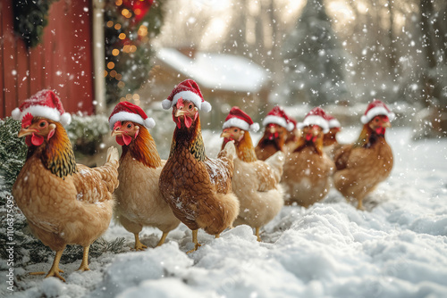 Braungefiederte Hühner mit Santa Claus Mütze stehen in verschneiter Landschaft. Geflügelmotiv erzeugt mit Generative AI.