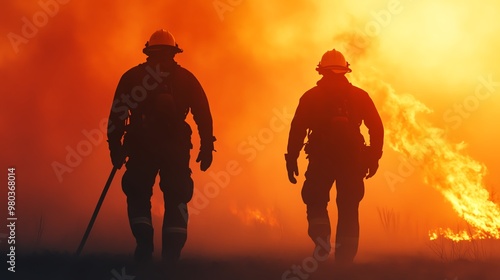 Brave firefighters battling wildfires, silhouetted against a fiery backdrop, showcasing courage and dedication to saving lives.