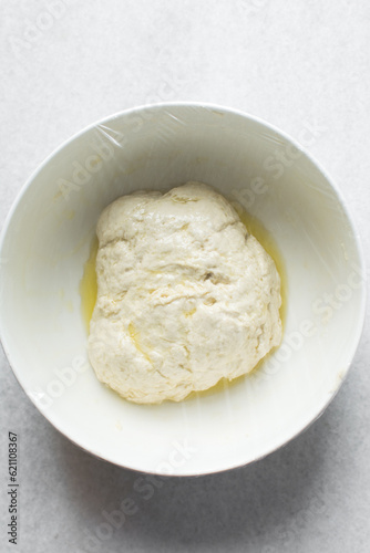 bread dough coated in olive oil, bread dough left to rise in white mixing bowl, process of making bread