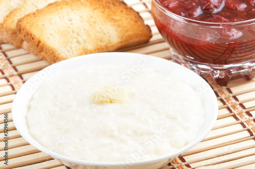 Breakfast. Rice cereal with jam and toast