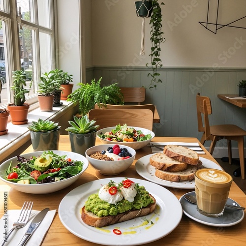 breakfast, food, table, eatery, meal, dish, plate, dining, cookery, brunch, morning, buffet, drink, hot drink, tea, juice, fruit, bread, egg, bacon, sausage, cheese, salad, butter, jam, yogurt, cereal, battercake, waffle, pastry, omelet, toast, napkin, cutlery, fork, knife, spoon, glasses, bowl, plated, serving, healthy, delicious, fresh, epicure, interior, setting, hospitality, decor