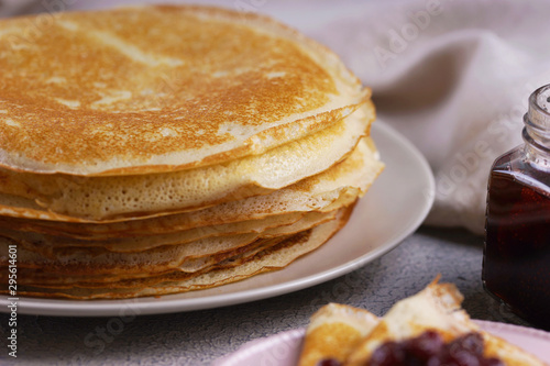 Breakfast with pancakes on a textured background