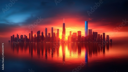 Breakthrough discovery impact concept. Vibrant sunset over a city skyline reflected in calm waters.