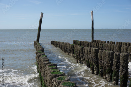 breakwater on the beach in summer with the sea