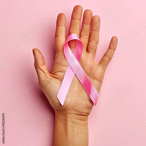 Breast Cancer Awareness month - Adult Woman hand holding Pink Ribbon on pink background for supporting people living and illness.