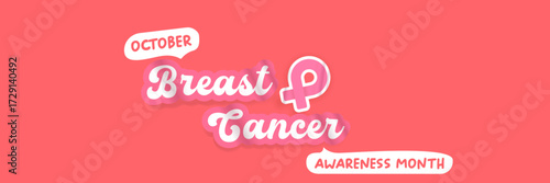 Breast cancer awareness month concept horizontal banner design template with pink ribbon and text isolated on pink background. October is Breast cancer awareness month vector flyer, banner, poster