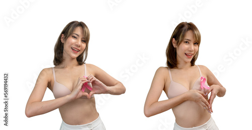 Breast Cancer, World cancer day. Young Asian woman make heart shape on isolated white background.