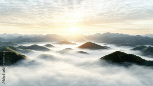 Breathtaking aerial view of misty mountains at sunrise, showcasing serene beauty and tranquility