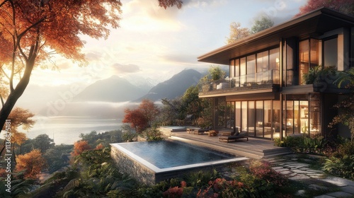 villa, luxury, lakeshore, autumn, scenery, nature, landscape, mountain, lake, foliage, tree, water, architecture, design, modern, pool, garden, calmness, serenity, peaceful, scenic, vacation, retreat, real, estate, home, terrace, deck, patio, balcony, exterior, residential, property, lifestyle, leisure, relaxation, atmosphere, panoramic