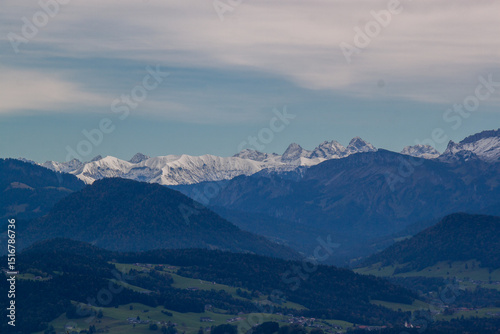 Breathtaking panoramic view from the Pfänder mountain in showcasing the majestic snow-capped Alps stretching across the horizon