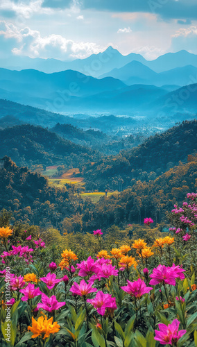 breathtaking panoramic view of hillside adorned with vibrant blooming flowers, showcasing stunning landscape of mountains and valleys background. scene evokes sense of tranquility and natural