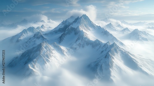 mountain, snow, peak, mist, cloud, landscape, winter, nature, adventure, wilderness, high altitude, remote, scenic, majestic, travel, dramatic, breathtaking, outdoors, calmness, beauty, panoramic, photo, natural wonder, cold, serenity, untouched, ice, elevation, peaceful, sunlight, snow-capped, aerial, pristine, mountain chain