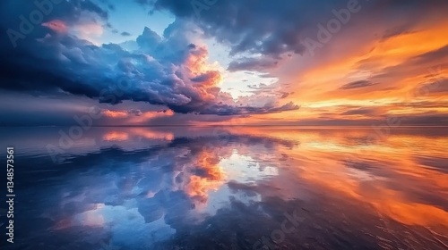 Breathtaking Sunset Over Calm Water with Dramatic Clouds and Reflections