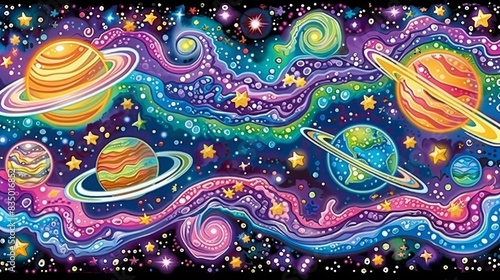 breathtaking view colorful galaxy space and planets set on dark background illustration, colorful planetary satellites on a black background