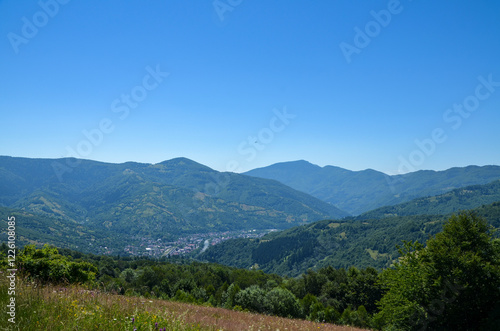 Breathtaking view of a mountain valley showcasing a picturesque Rakhiv town, lush green vegetation, and surrounding hills under a clear blue sky. Carpathian Mountains, Ukraine