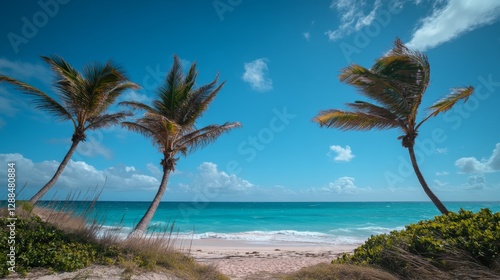 Breathtaking view of a peaceful beach with palm trees swaying in the gentle breeze. Ideal for relaxation and rejuvenation. Explore the tranquility of nature. Generative AI
