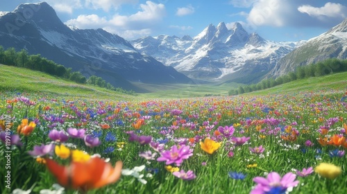 Breathtaking view of colorful blooms complemented by towering mountain peaks.