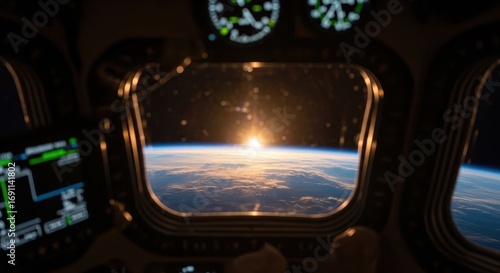 Breathtaking view of earth and sunrise from spacecraft window at dawn