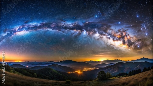 Breathtaking wide-angle night sky panorama featuring a millions-strong twinkling starfield above a serene, dark silhouette of rolling hills and mountainous landscape.