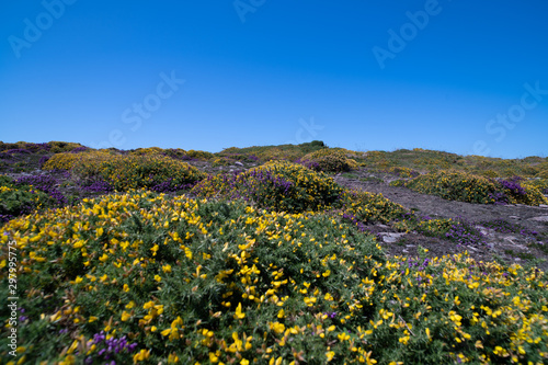 field, flower, countryside, heaven, nature, yellow, meadow, blue, summer, green, spring, grass, sunflower, farming, mountain, plant, rural, farm, beauty, cloud, hill, sun, brittany