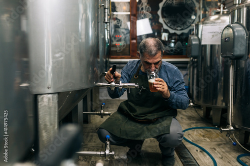 brewer examining taste and color of the beer in his craft beer brewery