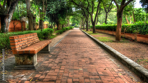 park, path, paseo, tree, garden, brick, pavement, bench, red, green, nature, landscape, alley, pathway, tranquil, peaceful, scenic, vegetation, foliage, plant, shrub, cosy, calm, relaxing, quiet, beauty, seating, exterior, daylight, sunlight, warm, shadow, perspective, long, lined, symmetric, brown, yellow, orange, grey, stone