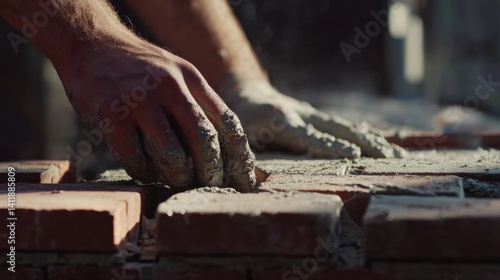 Bricklayer laying bricks for a garden wall. Featuring careful placement and technique