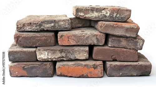 Bricks covered in dirt and grit, stacked unevenly with visible imperfections on a white background