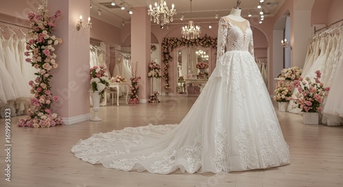 bridal, salon, gown, wedding, dress, mannequin, white, lace, long, sleeve, floor, length, train, elegant, romantic, luxury, boutique, pink, floral, arrangement, flower, rose, lighting, interior, design, style, fashion, shop, showcase, display, occasion, ceremony, preparation, celebration, love, marriage, bride, sophisticated, beautiful, dreamy, pristine, clean, showroom, sewing, delicate, detail