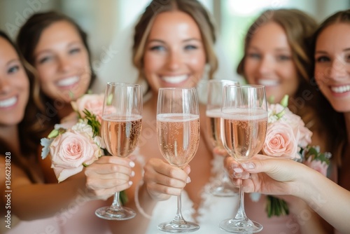 Bride and bridesmaids celebrate wedding day and drink rpink champagne from glasses together