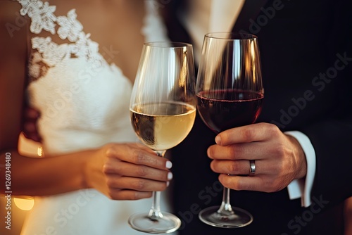 bride and groom holding glasses of wine in front of them. close-up. shallow depth of field.