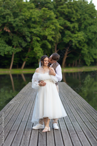 bride and groom on the bridge. The groom kisses the bride on the cheek, standing behind her. The groom gives the bride a strong hug. The newlyweds stand on a wooden bridge in the middle of a lake.