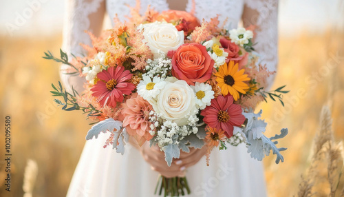 Bride holding a colorful wedding bouquet is posing in a field